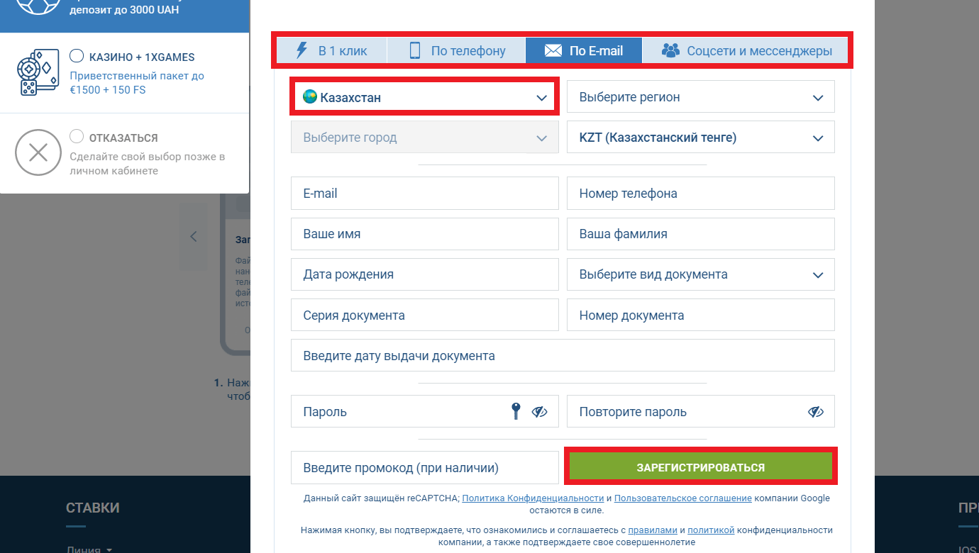1xBet регистрация по e-mail